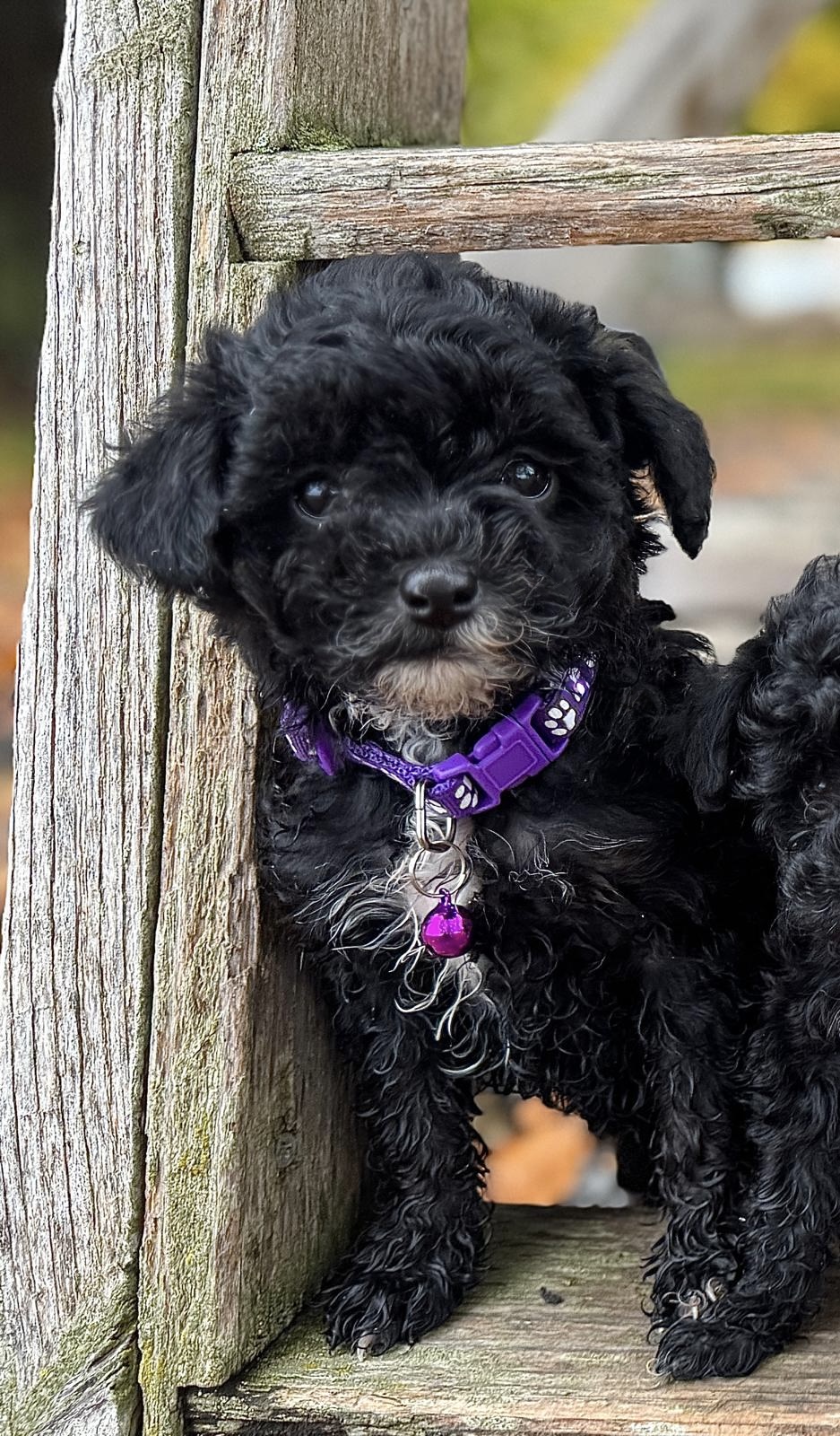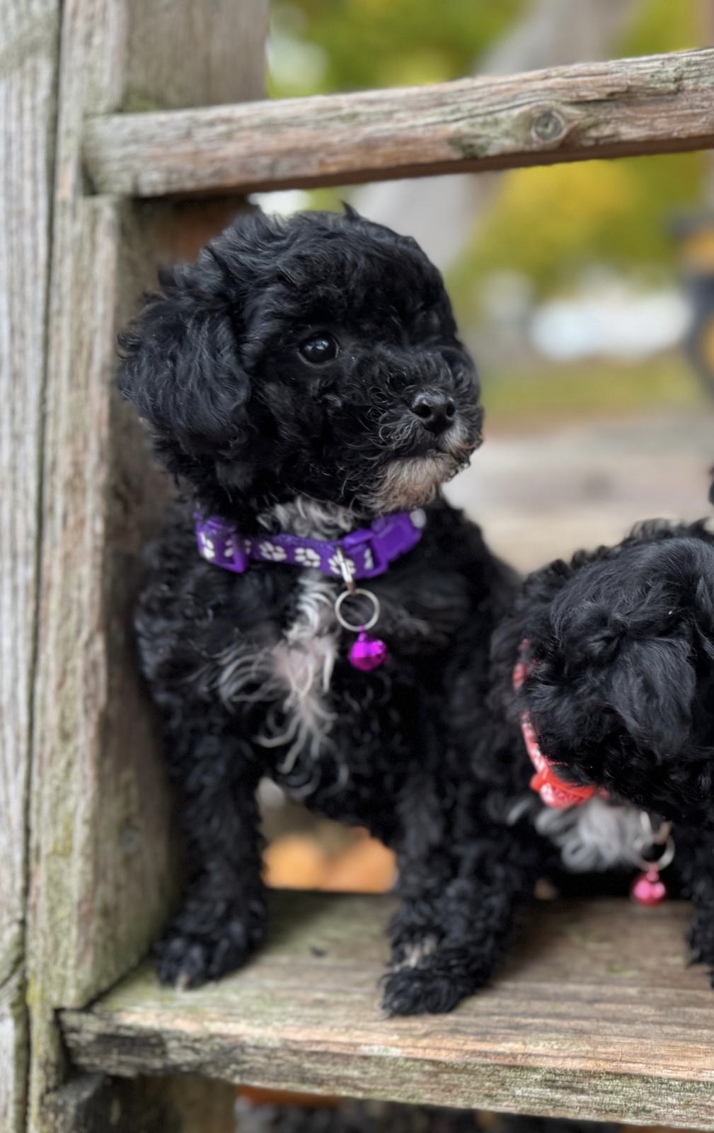 Piper, born 9/17/2025, is sweet black girl with white highlights. She is cheerful and friendly, the largest of the litter! She should mature between 7 – 10 pounds.